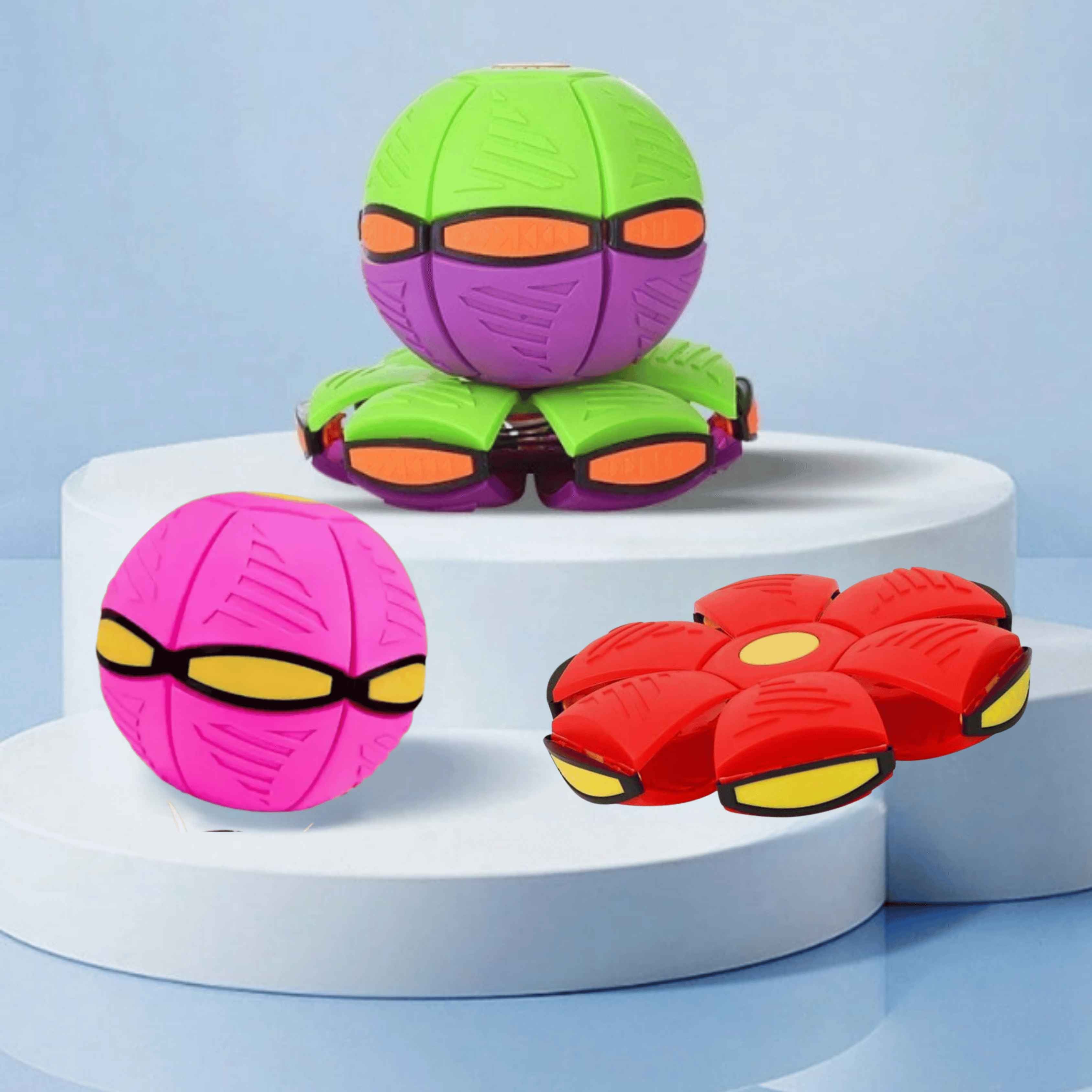 PopFlex tiene una forma plana que engaña a simple vista… pero en cuanto se aplasta, ¡se convierte en una pelota saltarina que prende luces al brincar!